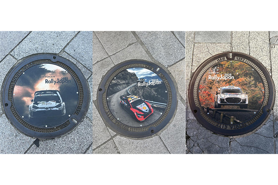 10月6日からは、コモ・スクエア前の支柱34カ所を、マニュファクチャラーチームや大会ビジュアルをデザインしたポスター(全12種類)で装飾。おなじみとなったデザインマンホール蓋は、2024年シーズンや今季のラリーカーの写真がプリントされた全24デザインが登場している。設置場所は、豊田市駅から喜多町5丁目交差点までの歩道に22デザイン、豊田市役所西庁舎2階下水道施設課前に2デザイン。