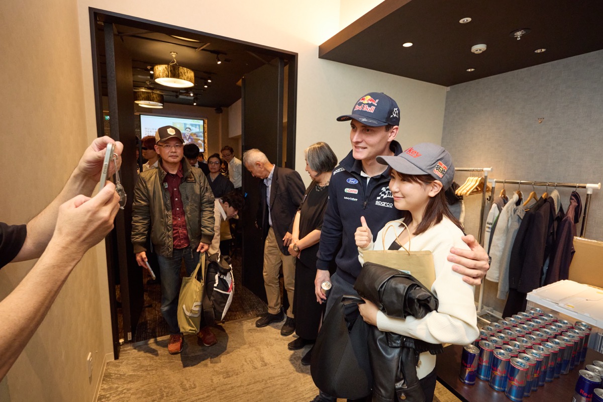 フルモー選手とRALLY PLUSの平松秀樹編集長、英語・イタリア語・フランス語に堪能でWRC現場からのホゲホゲ日記が大人気、WRC業界にも顔が広い伊藤敬子さんによるトークショーに始まり、フルモー選手への質問コーナー、伊藤さんの通訳でフルモー選手が各テーブルを回って歓談や写真撮影・サインに応じる濃密なファンサービスタイム、フルモー選手が日本式のジャンケンに目覚めたプレゼント大会、お帰りの際にはフルモー選手が率先してお見送り、最後のツーショット撮影にも気さくに応じてくれるなど、文字どおりフルモー選手を独占しての贅沢な内容となりました。