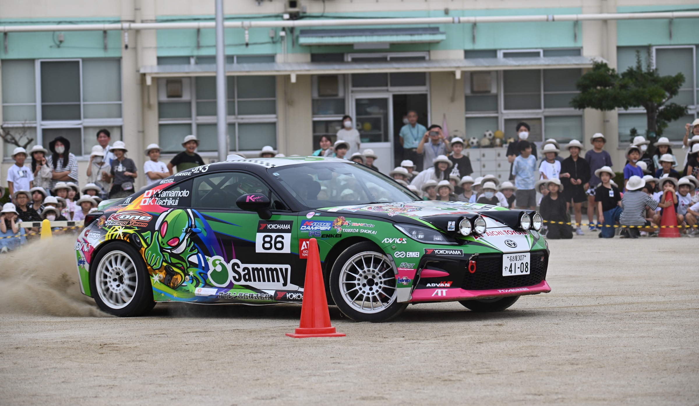 この出張ラリー講座では、学校の校庭を使ったデモンストレーションランも実施。ラリースクールを受講した児童だけでなく、全校児童で校庭を走り回るラリーカーのデモランを見学する時間も設けられました。彼らが常日頃使っている校庭にラリーカーが入ってきて、さらに砂煙を上げて走行する迫力ある走りに、多くの児童が大興奮。助手席にはクラス担任の先生や校長・教頭先生も乗り込むこともあり、その応援にも力が入りました。