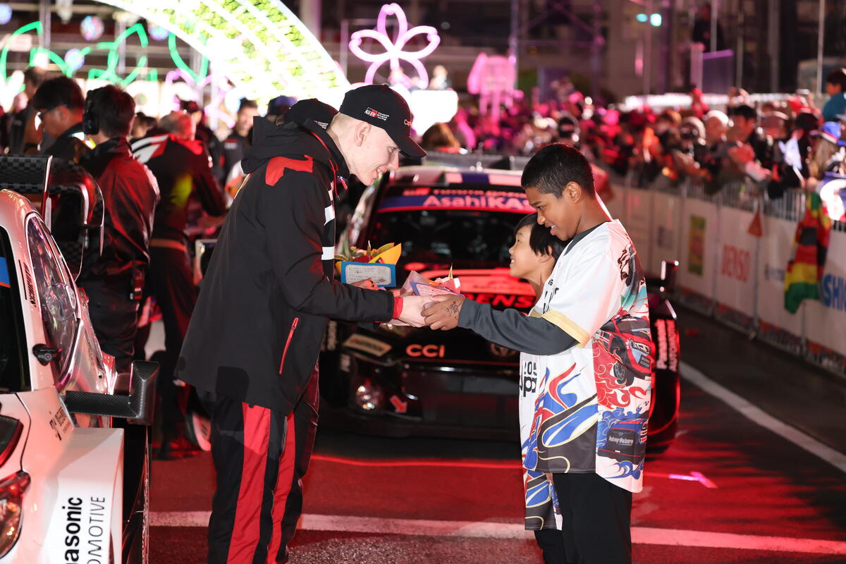 その後、午後4時過ぎからシェイクダウンと同じ全長2.75kmのステージで、SS1「クライガイケ・パークSSS」が行なわれ、ロバンペラがベストタイムを記録し初日首位に。勝田が0.3秒差の総合3位、オジエが0.4秒差の総合4位、パヤリが0.5秒差の総合5位、エバンスが0.8秒差の総合6位につけ、TGR-WRTは全車がラリー初日を順調に走り終えました。その後、日没を迎えた豊田市駅前でウェルカムショーが行われ、SS1を走り終えたクルマとドライバーが集合。大勢のファンが見守る中ショーは進み、ラリーは華やかなムードに包まれて初日が終了しました。