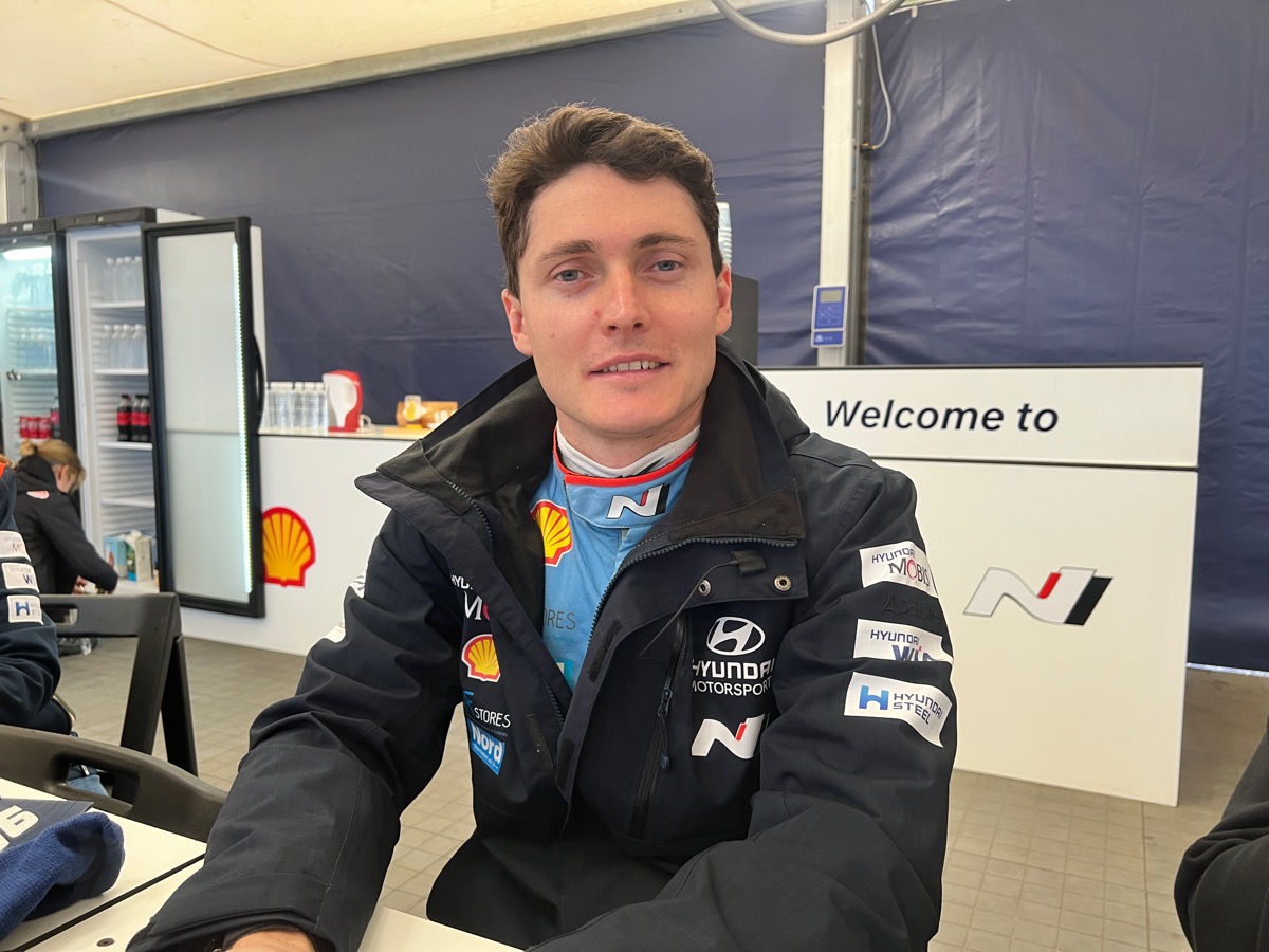 WRCラリージャパン、SS15『Nukata(20.23km)』で立木にボディ右サイドをヒットし、コ・ドライバー側のドアを失う大ダメージを負い、ステージフィニッシュ後にリタイアとなったヒョンデのアドリアン・フルモー。豊田スタジアムのサービスに戻ってから、状況を説明した。