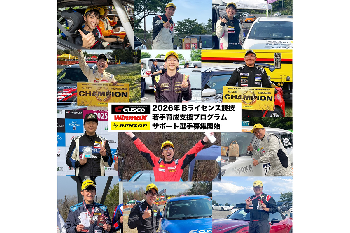 CUSCOブランドを展開するキャロッセは、WinmaXブランドを展開するエムケーカシヤマ、住友ゴム工業DUNLOPモータースポーツ部のジョイント企画として2020年から実施している『CUSCO & WinmaX & DUNLOP・Bライセンス競技若手育成支援プログラム』の、2026年サポート選手募集を開始したことを発表した。ラリー、ダートトライアル、ジムカーナの全日本選手権や地方選手権でステップアップを目指す若手ドライバーを支援する。地方選手権サポート選手については、全日本戦スポット参戦を1戦限定で支援する。