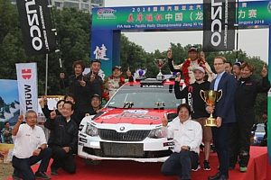 会場では、同じくシュコダ・ファビアR5でWRC2タイトルを獲得したヤン・コペッキー/パベル・ドレスラー組や、シュコダ・モータースポーツの首脳陣と記念撮影をする場面も。日本のラリー界にとって、誇らしいショットが届けられた。