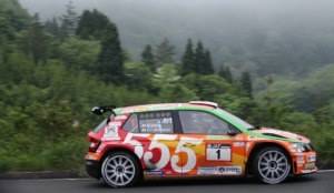 「道が水たまりだらけですごい。明日はそれがどうなるかだな。ホントはドライの方がいいけどね……。クルマは前回の唐津よりは多少良くなったと思うよ。目標は優勝」と新井。