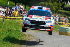 コペッキーもこのステージの3km地点の右コーナーで「リヤエンドが完全にディッチにはまった」と伝えており、ズリンに使用されたのは1994年以来というこのステージを「非常にトリッキー」と表した。しかし、カイスが優勝争いから脱落したことで、コペッキーのアクシデントは大きな痛手にはならず、このSS6ではトップタイムを叩き出してリードを12.1秒に広げた。ここで2番手に浮上したミコロス・チョモス(シュコダ・ファビア・ラリー2 Evo)も、ステージフィニッシュ付近で軽いスピンを喫している。ハンガリーのチョモスは、SS3でベストタイムをマークし、ここで首位に立つなど健闘を見せており、自身初のERC戦でのポディウム圏内につけてこの日を終えている。
